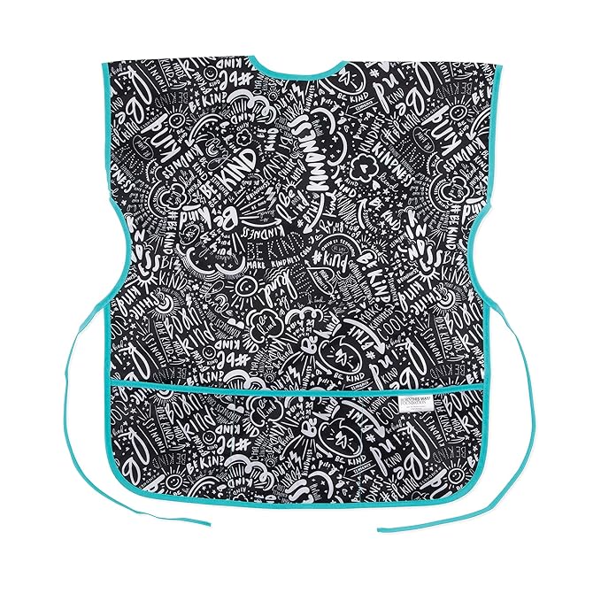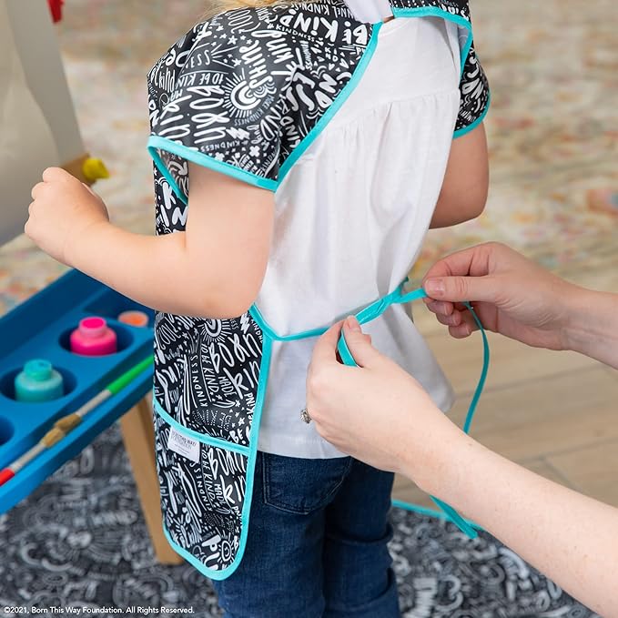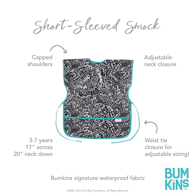 - Adjustable tie waist and a hook and loop neck closure. It also doubles as a bib for messy eaters that have outgrown their Bibs.