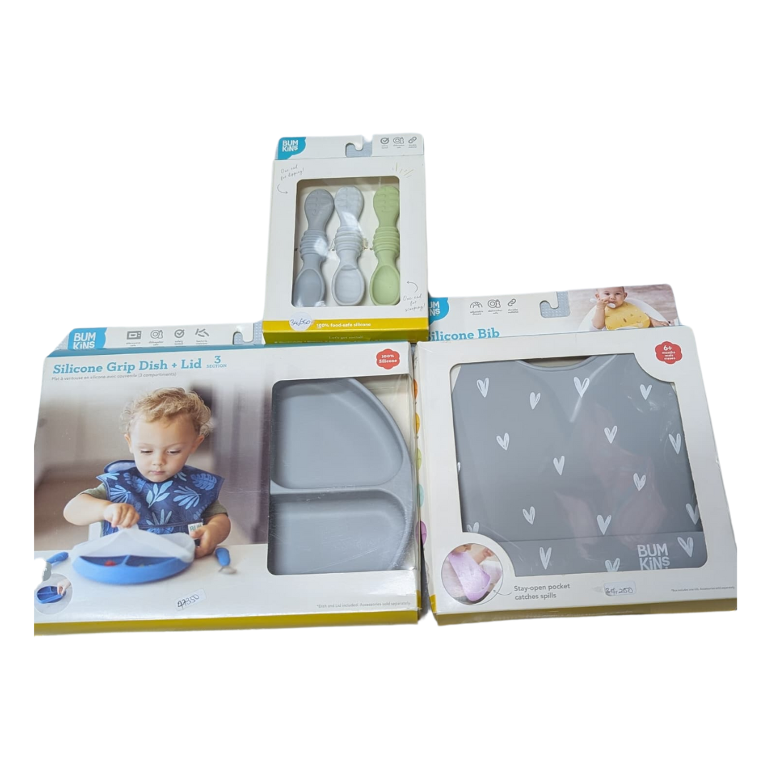 Gift Box contains Silicone Grip Dish + Lid 3 section, Silicone Dipping spoons 3 pack and Silicone bib